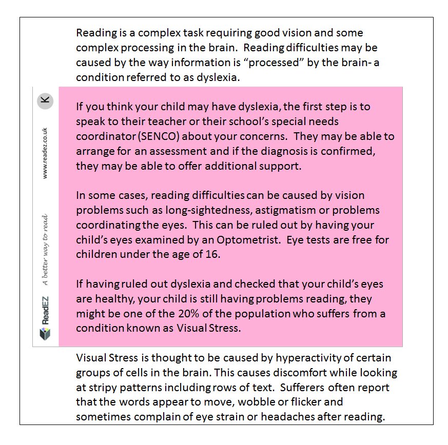 Packs of ReadEZ Overlays (one colour).  A5 sheets made of durable acetate. Designed by a team of vision scientists, the Overlays use carefully selected colours to minimise the symptoms of visual stress.
